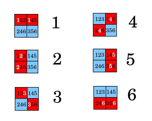 The stategy is to assign each person to one of the above colorings, and then in each well mix the samples from testees such that if one (and only one) person is positive, the resulting coloring will match the assigned person. To do this, place each person's two samples in the wells as shown below.